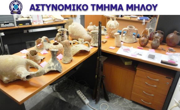 Τα δύο αδέρφια, ηλικίας 37 και 38 χρόνων συνελήφθησαν χθες στη Μήλο και κατηγορούνται για παράβαση της νομοθεσίας περί Προστασίας των Αρχαιοτήτων και εν γένει της Πολιτιστικής Κληρονομιάς, καθώς και για παράνομη κατοχή όπλων, κροτίδων και ναρκωτικών.