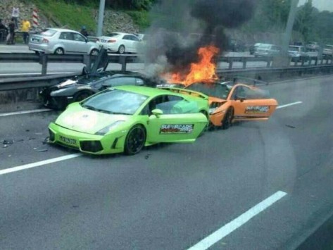 Μια Lamborghini Aventador και δύο Lamborghini Gallardos τυλίχθηκαν στις φλόγες μετά από ατύχημα σε δρόμο μεγάλης κυκλοφορίας στην πρωτεύουσα της Μαλαισία, Κουάλα Λουμπούρ.