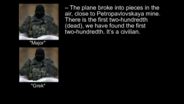 Οι ουκρανικές υπηρεσίες υπέκλεψαν συνομιλίες ανάμεσα στον διοικητή των φιλορώσων αυτονομιστών Ιγκορ Βέζλερ (Μπες), τον Ρώσο συνταγματάρχη Βασίλ Μικολάιοβιτς Γκεράνιν και τον στρατιωτικό διοικητή των Κοζάκων Μίκολα Κοζίτσιν που συζητούν την κατάρριψη του αεροπλάνου.