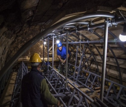 Εχει, λοιπόν, ήδη ολοκληρωθεί η αντιστήριξη στην στέψη των πλαϊνών τοίχων και έχει ξεκινήσει η τοποθέτηση της υποστύλωσης της θόλου, με μεταλικές σωληνωτές δοκούς.