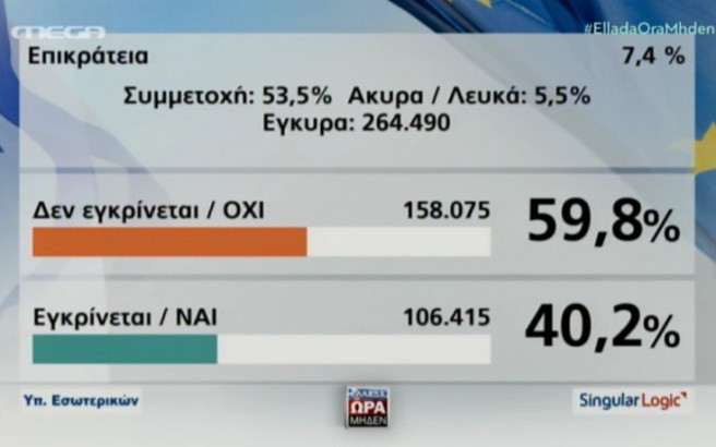 Την επικράτηση του «Όχι» με μεγάλη διαφορά από το «Ναι» δείχνει το πρώτο αποτέλεσμα από την Επικράτεια.