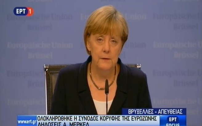 «Συζητήσαμε πολύ σοβαρά την δύσκολη κατάσταση που υπάρχει στην Ελλάδα. Για όλους μας ισχύει ότι πρέπει να προστατέψουμε το ευρώ. Η Αθήνα πρέπει να υποβάλει αύριο ένα πρόγραμμα στον ESM και μέχρι την Πέμπτη να έχει υποβάλει λεπτομερέστατες προτάσεις εν προκειμένω. Η κατάσταση του EFSF για το προηγούμενο πρόγραμμα έχει τελειώσει. Η συζήτηση είναι μια συζήτηση πολυετής για ένα πρόγραμμα καινούργιο και πολυετές που δεν αφορά το προηγούμενο πρόγραμμα που έχει λήξει» τόνισε η κ. Μέρκελ και πρόσθεσε: «Από τη γερμανική πλευρά πρέπει μετά την κατάθεση του προγράμματος να ζητήσουμε εντολή διαπραγμάτευσης από την γερμανική βουλή λαμβάνοντας υπόψη τις λεπτομερείς προτάσεις της κυβέρνησης και εάν την πάρουμε να ξεκινήσει ο διάλογος. Οι αρχηγοί των 28 κρατών μελών της ΕΕ θα βρεθούν την Κυριακή γιατί πρόκειται για ένα ζήτημα τα οποία δεν είναι μέλη της Ευρωζώνης. Αυτό καταδεικνύει ότι υπάρχουν ελάχιστες μέρες για να φτάσουμε σε ένα συμπέρασμα του πως θα πάμε παρακάτω».