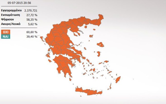 Πάνω από το 60% κυμαίνεται το ποσοστό του «Όχι» σε όλη τη χώρα, με καταμετρημένο το 27,72% των ψήφων.
